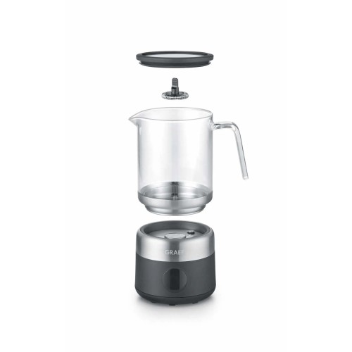 Високоякісний корпус у дизайні GRAEF, 5 універсальних програм (об'ємна молочна піна / кремова молочна піна / тепле молоко / гарячий шоколад / холодна піна) для індивідуального задоволення, сенсорне керування. Скляний молочник з позначкою рівня наповнення, знімний і можна мити в посудомийній машині