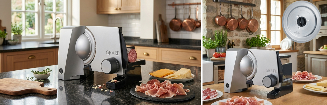 Слайсер електричний S10025 — зручний та ефективний кухонний прилад для щоденного використання. Він дозволяє швидко й акуратно нарізати м’ясо, сир, ковбаси, хліб і овочі, забезпечуючи рівні скибки без зайвих зусиль. Завдяки гострому дисковому ножу та стабільній роботі двигуна ви отримуєте якісний результат, наближений до професійного.
