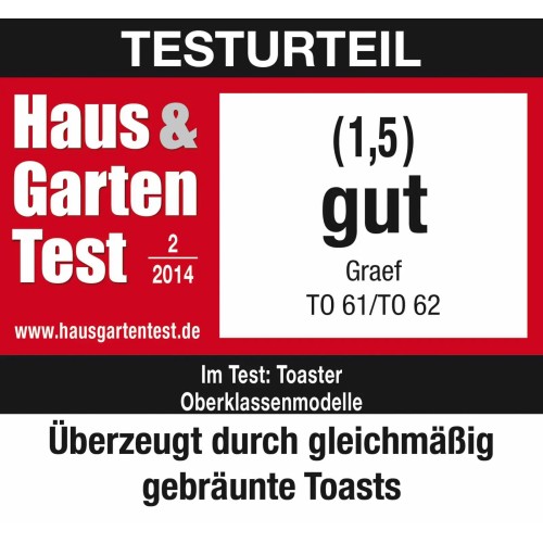 Купити тостер Graef TO 61 насамперед коштує тому, що ця модель тостера зробить приготування бутербродів дуже швидким та простим. Ви зможете приготувати не тільки 2 тости, а й 2 великі бутерброди. Щоб шматочки були рівномірно підсмаженими, виробник оснастив апарат спеціальною функцією, яка виконує їхнє центрування. Для повного забезпечення вашої безпеки під час роботи з апаратом, тостер відключиться саме в той момент, коли шматочок застрягне під час приготування і не буде автоматично вилучений з тостера .